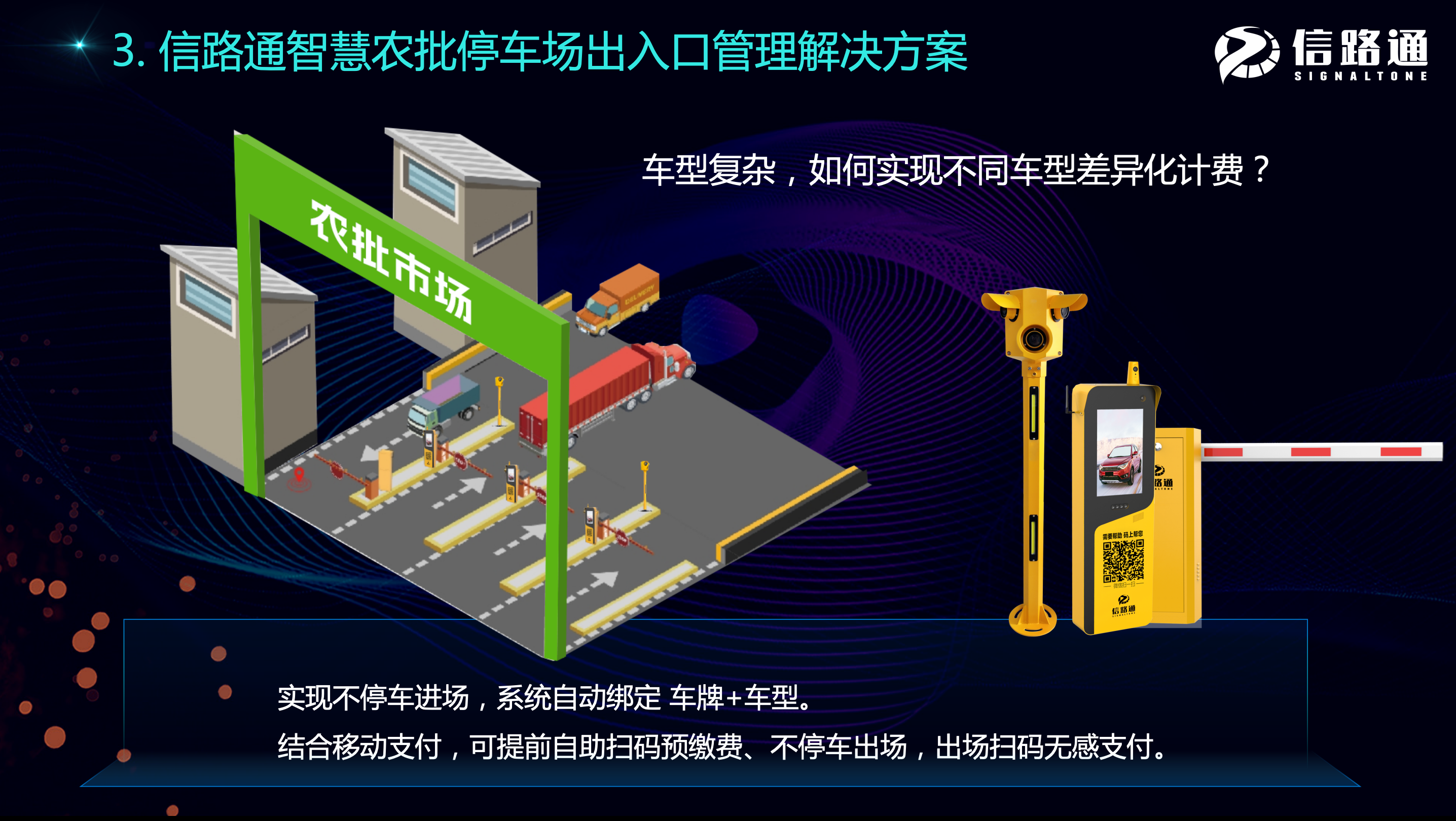 信路通車型識(shí)別停車管理系統(tǒng),精準(zhǔn)區(qū)分農(nóng)批市場(chǎng)進(jìn)出的復(fù)雜車輛類型,實(shí)現(xiàn)停車費(fèi)用差異化計(jì)價(jià),降低人力成本,減輕出口排隊(duì)堵塞,解決因進(jìn)出車型復(fù)雜產(chǎn)生的主觀性、非主觀性收費(fèi)漏洞、甩掛換掛等問(wèn)題。