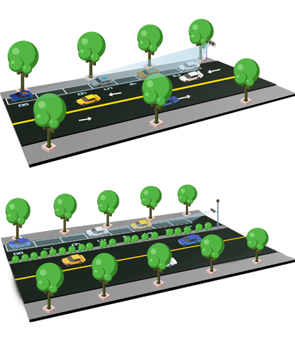 ? 中位斜照:安裝于停車泊位道路對(duì)側(cè),最多可覆蓋8個(gè)泊位